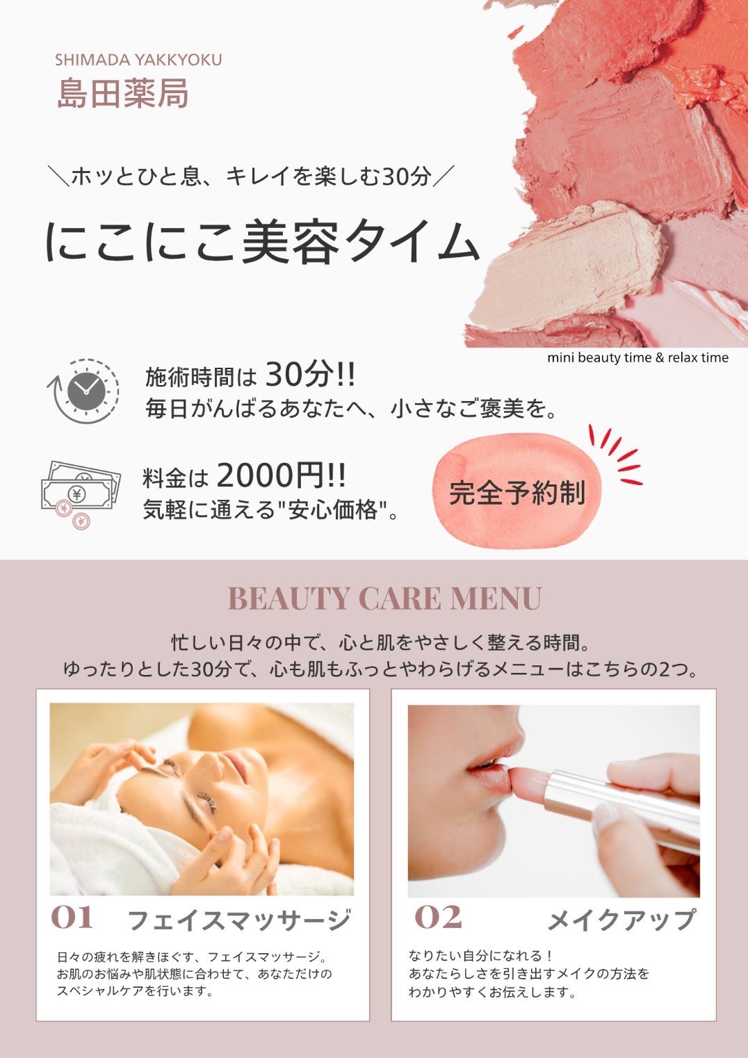 当店では、お化粧の力でお客さまを元気にしたい!そんな思いで「にこにこ美容タイム」を開催することにしました。施術は、元SHISEIDO美容部歴22年の藤ノ木知子さん。「フェイスマッサージ」または「メイク」体験。プロの手でやさしくケアし、鏡を見て”うれしい“と感じる時間をお届けします❤️